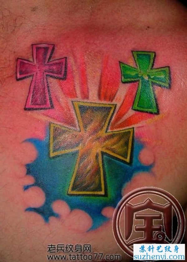 胸部漂亮的彩色十字架纹身图案_十字架纹身图案大全_纹身图吧