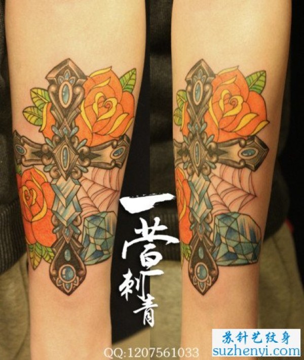 手臂精美的十字架钻石纹身_十字架纹身图案大全_纹身图吧