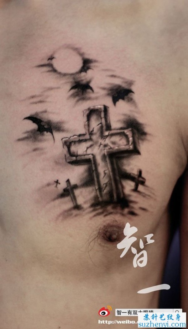 胸部十字架与蝙蝠纹身_十字架纹身图案大全_纹身图吧