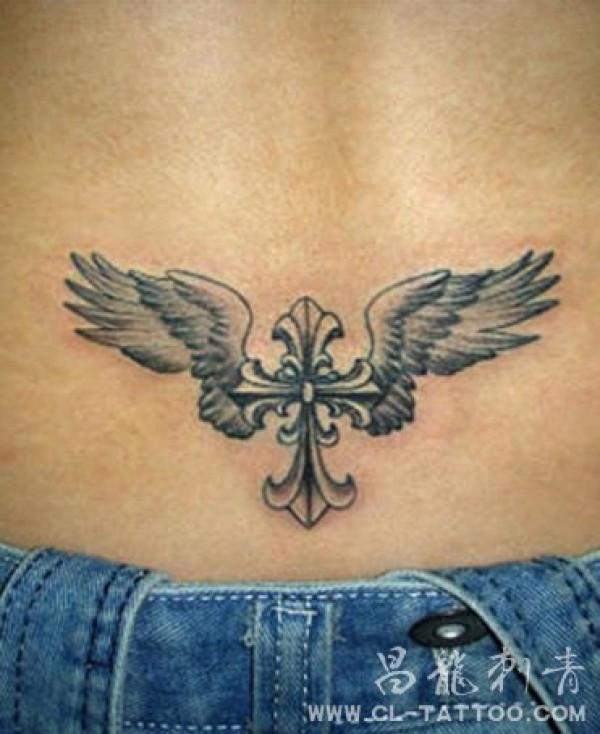 女生背部时尚流行的十字架翅膀纹身图案_十字架纹身图案大全_纹身图吧