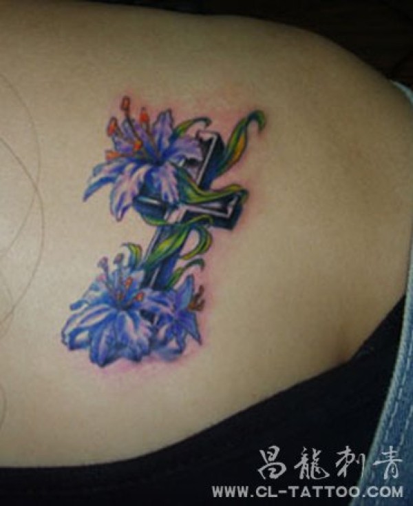 小花与十字架_女生彩色_十字架纹身图案大全_纹身图吧