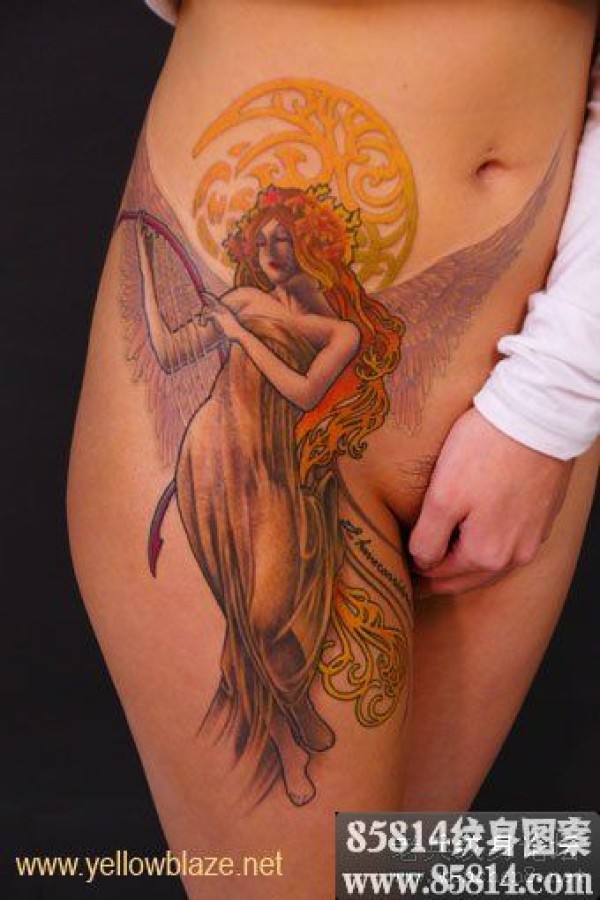 女性大腿侧部的女神纹身_腿部纹身图案大全_纹身图吧