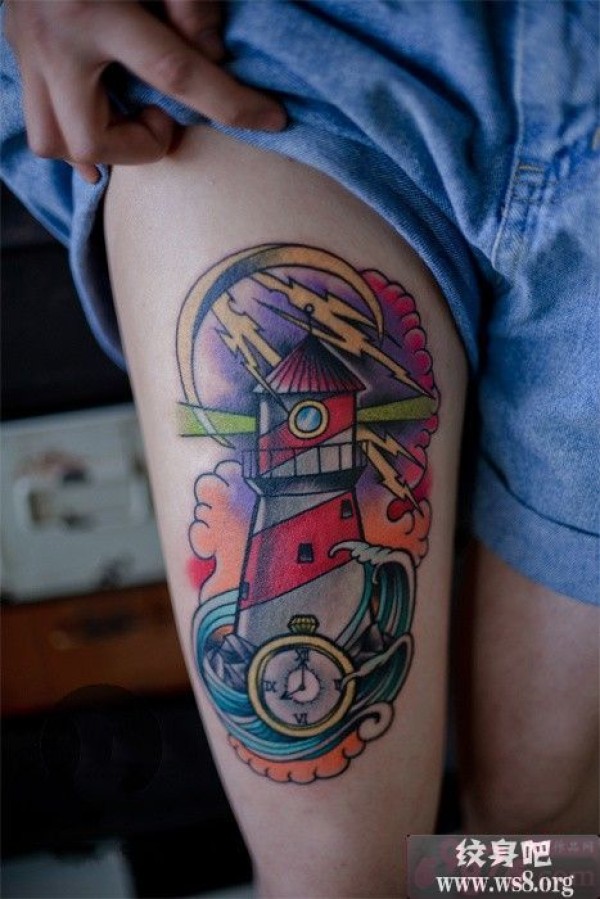 腿部海上灯塔与指南针纹身图案_腿部纹身图案大全_纹身图吧