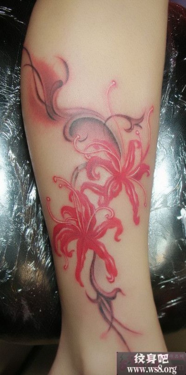 小腿鲜艳彼岸花时尚纹身图案_腿部纹身图案大全_纹身图吧