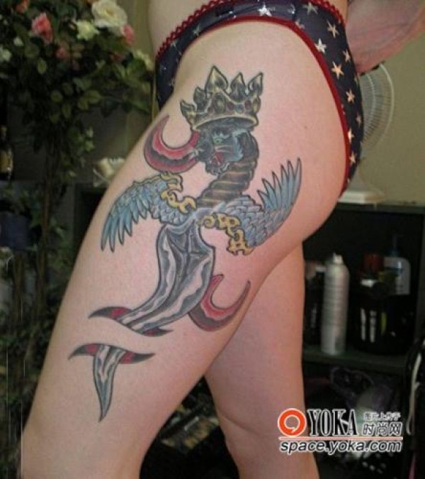 腿部时尚船锚与蛇纹身图案_腿部纹身图案大全_纹身图吧