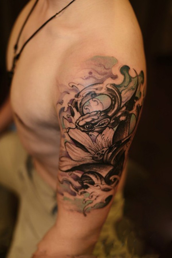 腿部蛇彩色莲花纹身图案_腿部纹身图案大全_纹身图吧