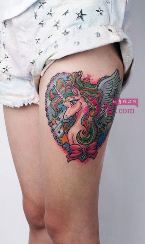 炫彩独角兽大腿时尚纹身_腿部纹身图案大全_纹身图吧