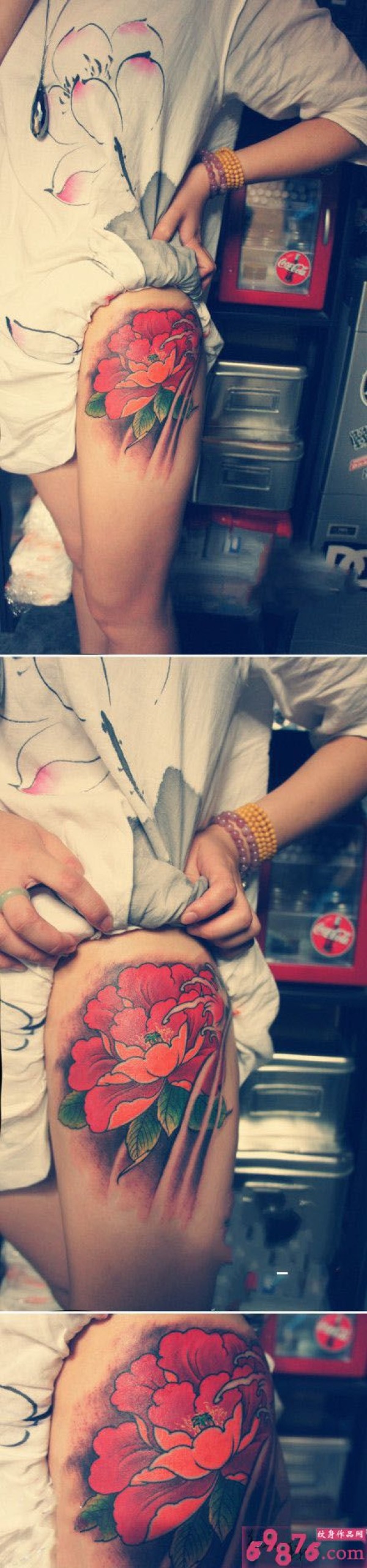 传统大红牡丹花大腿纹身_腿部纹身图案大全_纹身图吧