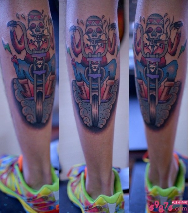 骑摩托的骷髅人创意花腿纹身_腿部纹身图案大全_纹身图吧