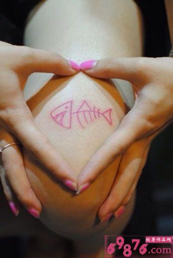 粉色鱼骨头创意大腿纹身_腿部纹身图案大全_纹身图吧