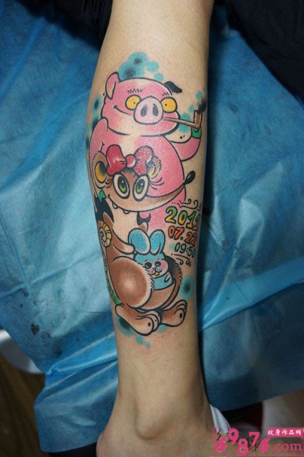 粉色猪与袋鼠花小腿纹身_腿部纹身图案大全_纹身图吧