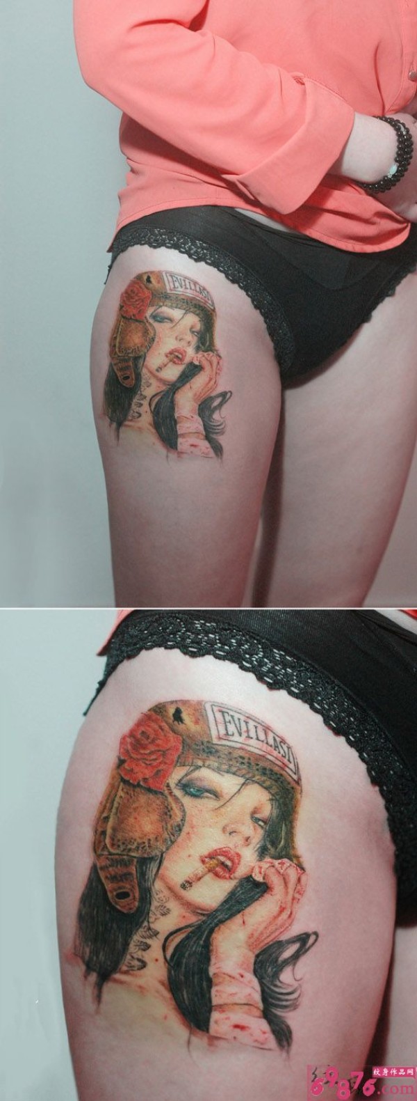 创意腥红色抽烟美女大腿纹身_腿部纹身图案大全_纹身图吧