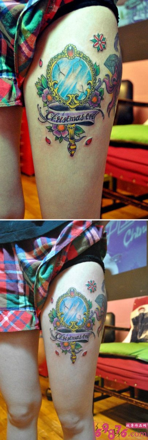 创意欧美风镜子与花纹身_腿部纹身图案大全_纹身图吧