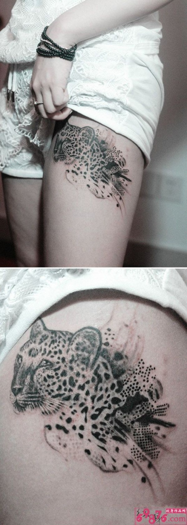 水墨风飞舞的豹子大腿纹身_腿部纹身图案大全_纹身图吧