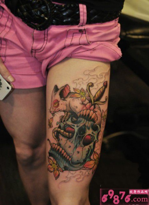 复古骷髅剑创意兔子大腿纹身_腿部纹身图案大全_纹身图吧