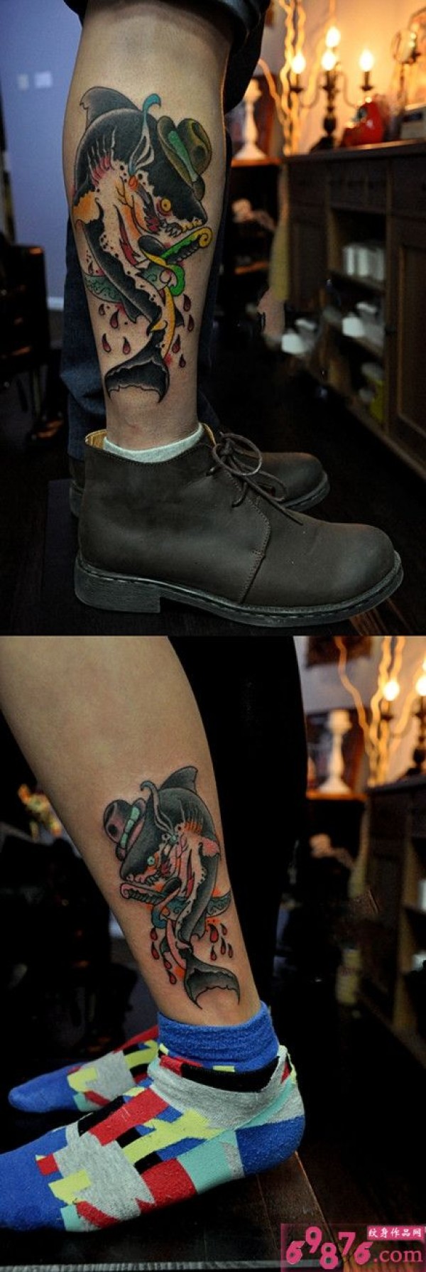 霸气鲨鱼黑帮个性小腿纹身_腿部纹身图案大全_纹身图吧
