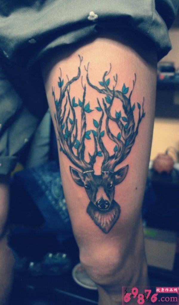 麋鹿生命树创意腿部纹身_腿部纹身图案大全_纹身图吧