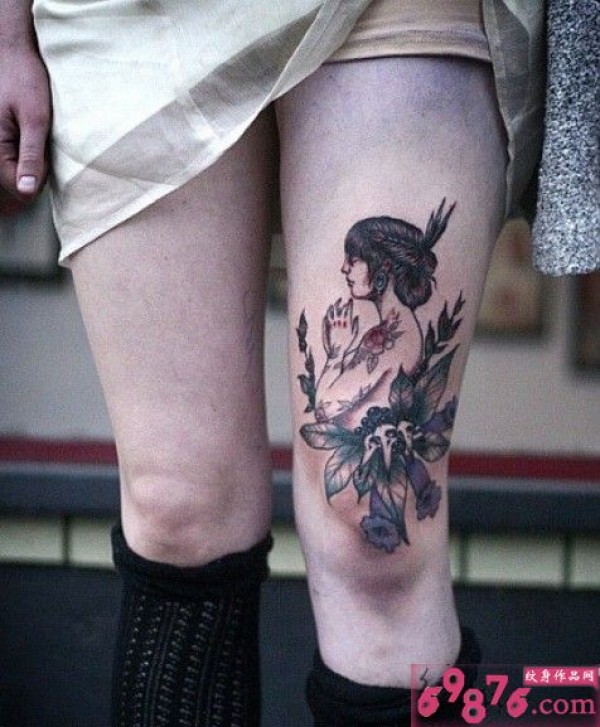 美女肖像创意大腿纹身_腿部纹身图案大全_纹身图吧