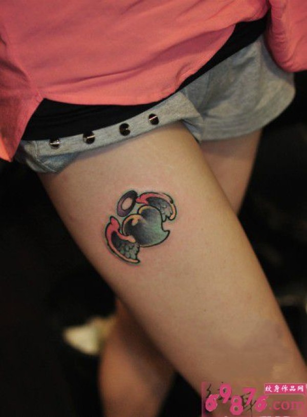翅膀红心可爱大腿纹身_腿部纹身图案大全_纹身图吧