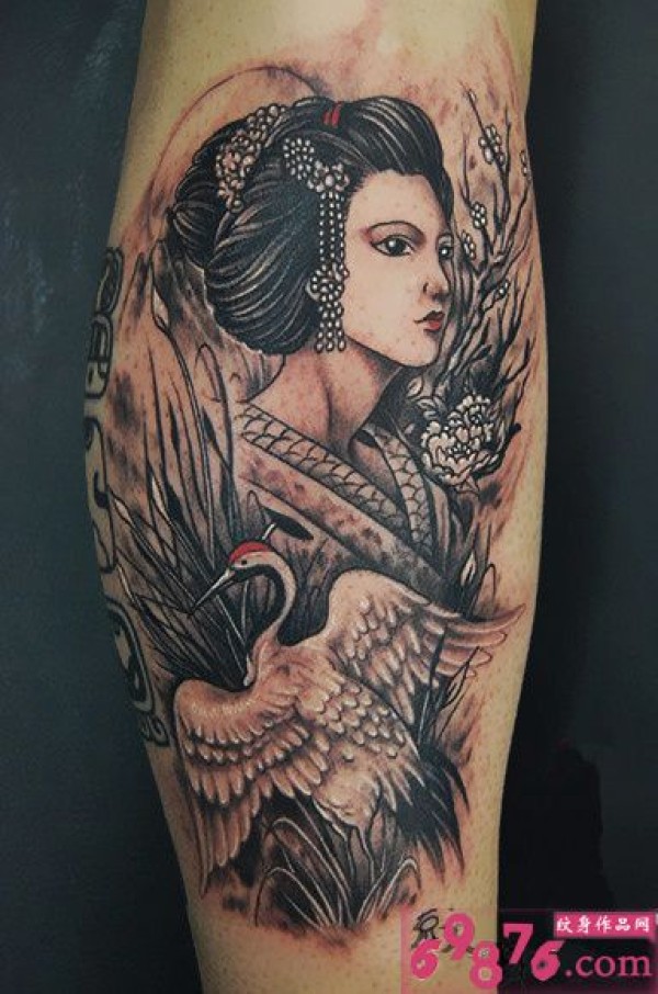 艺妓与仙鹤复古纹身_腿部纹身图案大全_纹身图吧