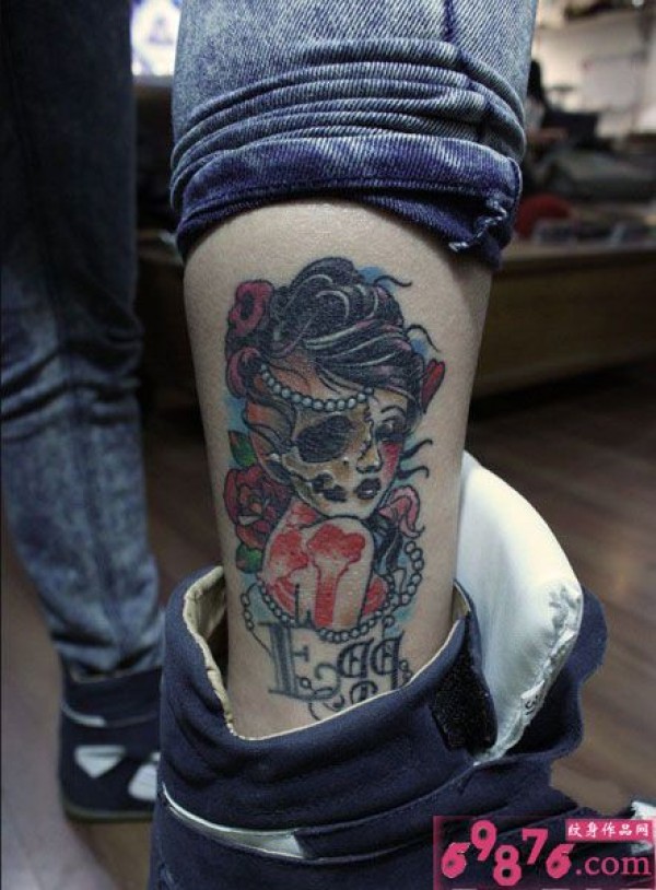 假面骷髅美女复古纹身_腿部纹身图案大全_纹身图吧