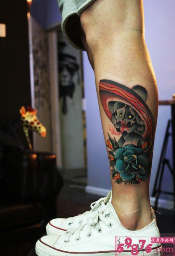 诡异的帽子姑娘创意小腿纹身_腿部纹身图案大全_纹身图吧