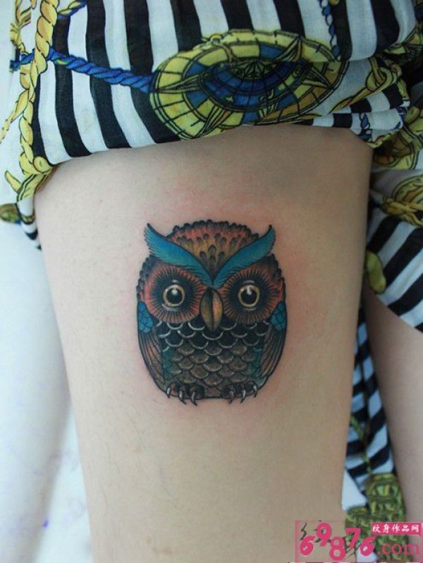 美腿彩色猫头鹰可爱纹身_腿部纹身图案大全_纹身图吧