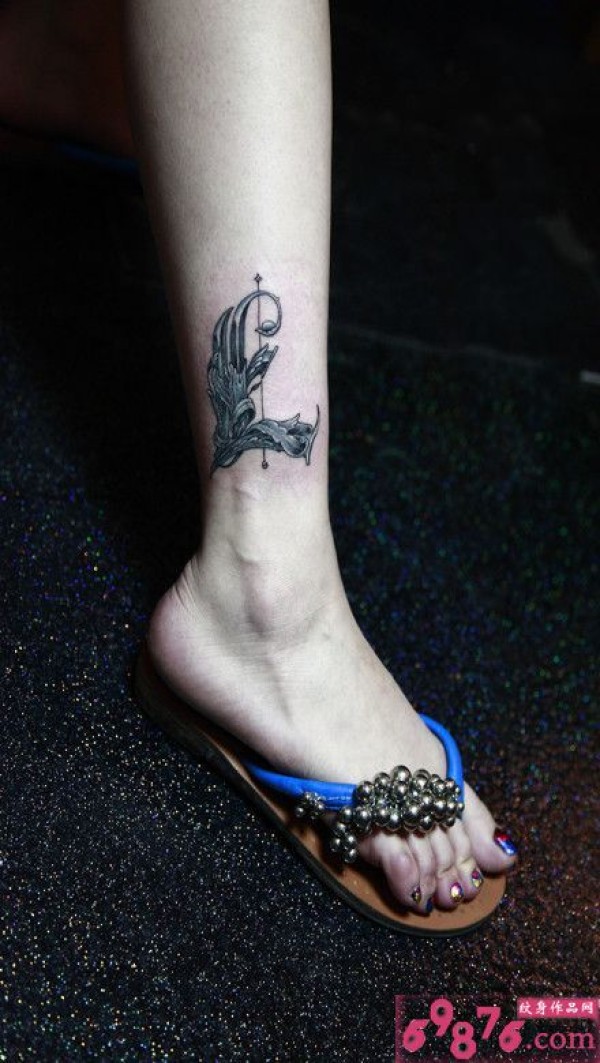 创意羽毛字母L小腿纹身_腿部纹身图案大全_纹身图吧