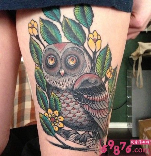欧美创意猫头鹰羽毛纹身_腿部纹身图案大全_纹身图吧