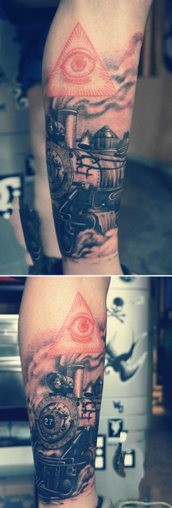 复古列车头小腿纹身_腿部纹身图案大全_纹身图吧