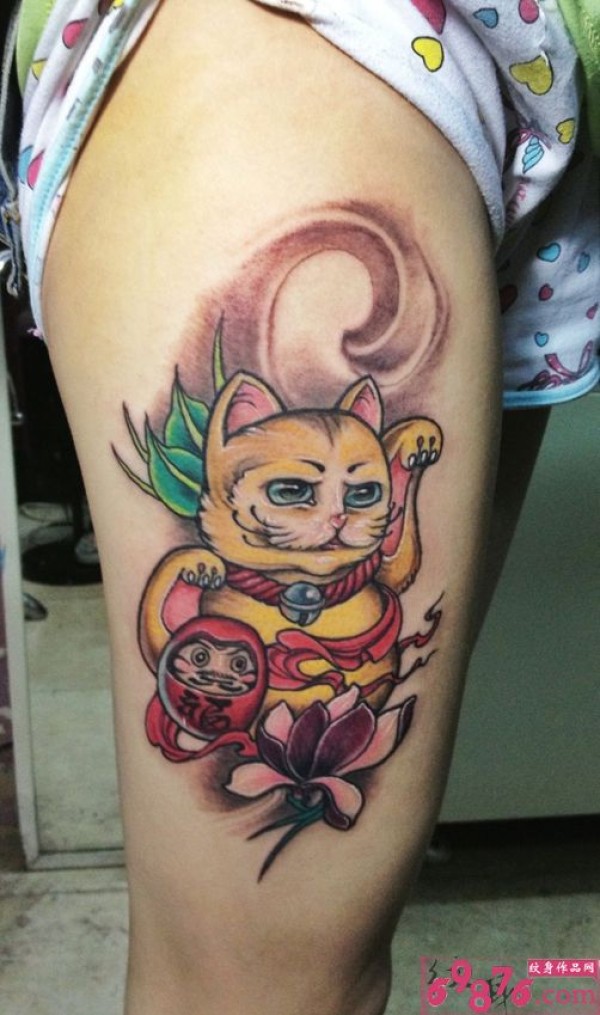 招财招福猫大腿纹身_腿部纹身图案大全_纹身图吧