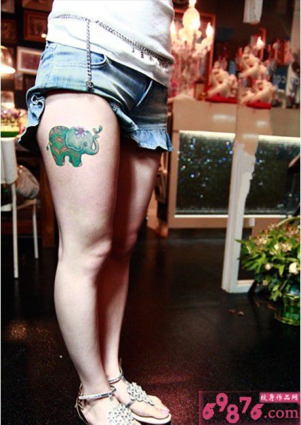 女生夏日清爽绿色小象纹身_腿部纹身图案大全_纹身图吧