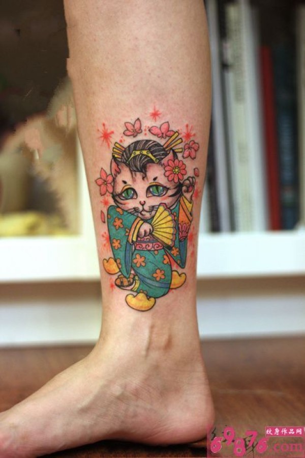 创意猫咪艺妓小腿纹身_腿部纹身图案大全_纹身图吧