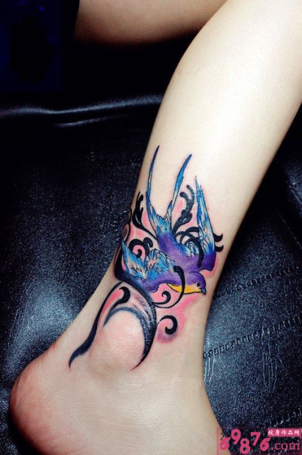 飞翔彩色燕子腿部纹身_腿部纹身图案大全_纹身图吧