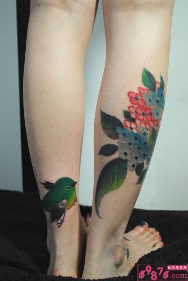 小腿清新花与小鸟纹身_腿部纹身图案大全_纹身图吧