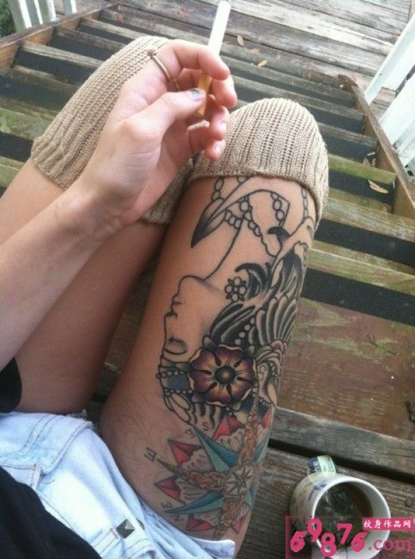 大腿创意美女指南针刺青_腿部纹身图案大全_纹身图吧