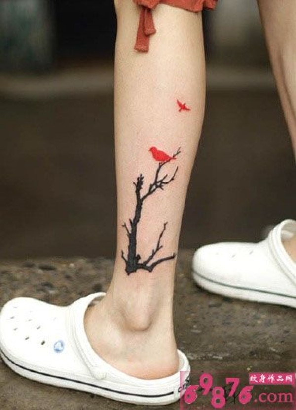 女孩小腿树枝小鸟刺青_腿部纹身图案大全_纹身图吧