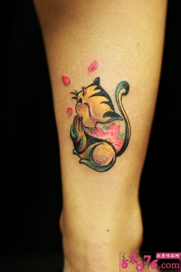 后脚踝猫咪樱花纹身_腿部纹身图案大全_纹身图吧