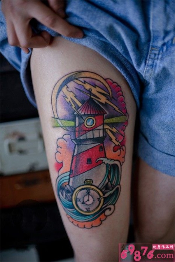 腿部海上灯塔与指南针纹身_腿部纹身图案大全_纹身图吧