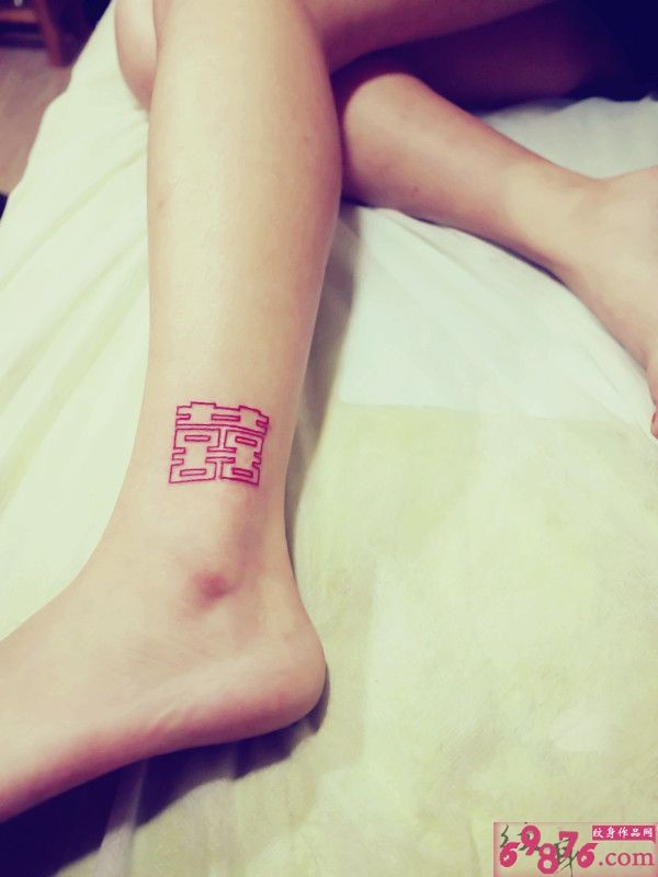 脚部时尚大红双喜字纹身_腿部纹身图案大全_纹身图吧