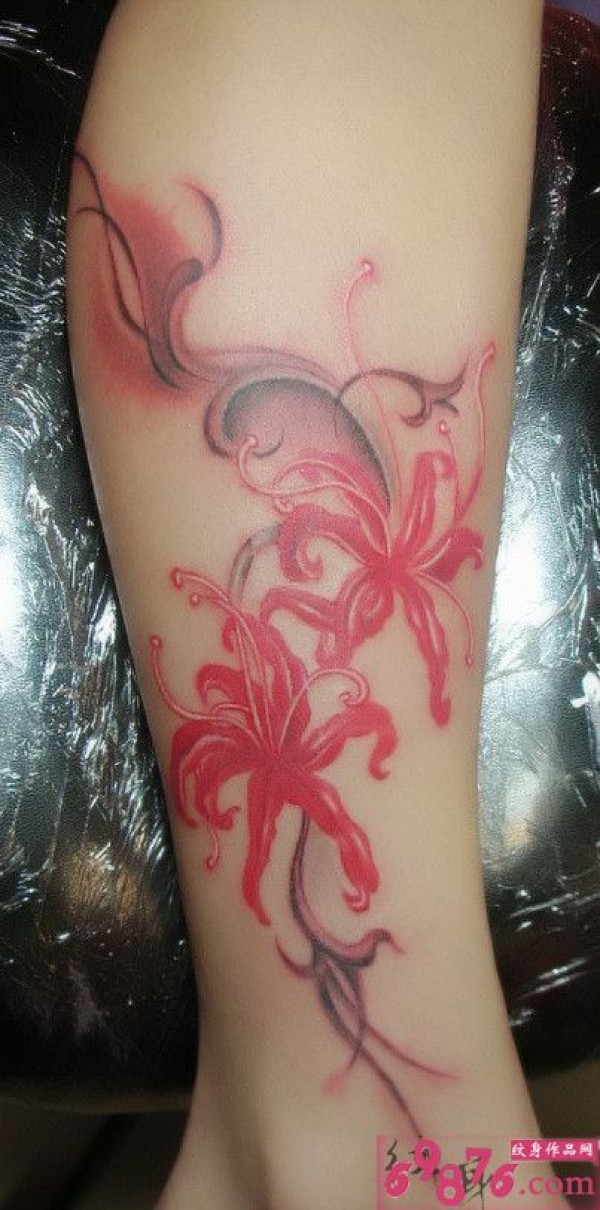 小腿鲜艳彼岸花时尚纹身_腿部纹身图案大全_纹身图吧