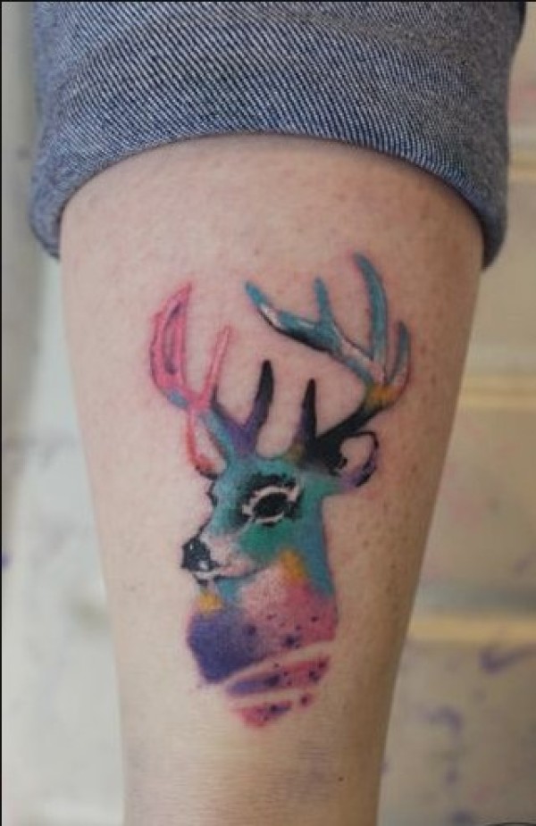 腿部漂亮彩色小鹿纹身_腿部纹身图案大全_纹身图吧