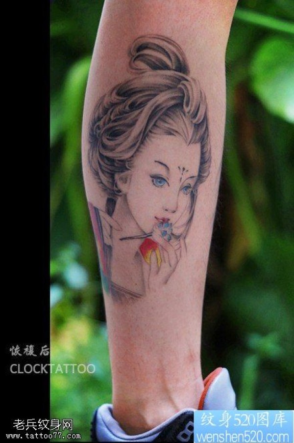 小腿部吹笛子的艺妓纹身图片_腿部纹身图案大全_纹身图吧