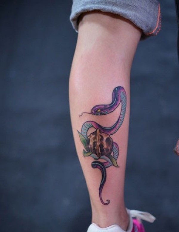 小腿部一条彩色的蛇纹身_腿部纹身图案大全_纹身图吧
