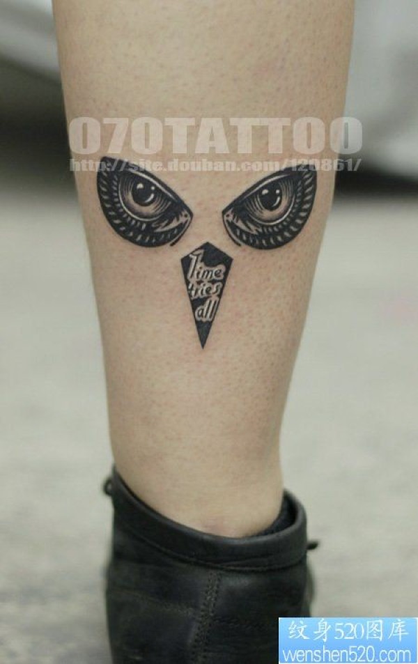 小腿上一幅个性的猫头鹰纹身图片_腿部纹身图案大全_纹身图吧