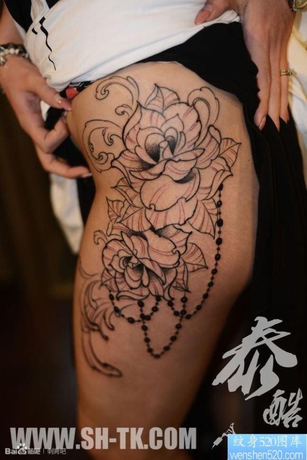 女人一幅大腿线条花珠子纹身图片_腿部纹身图案大全_纹身图吧