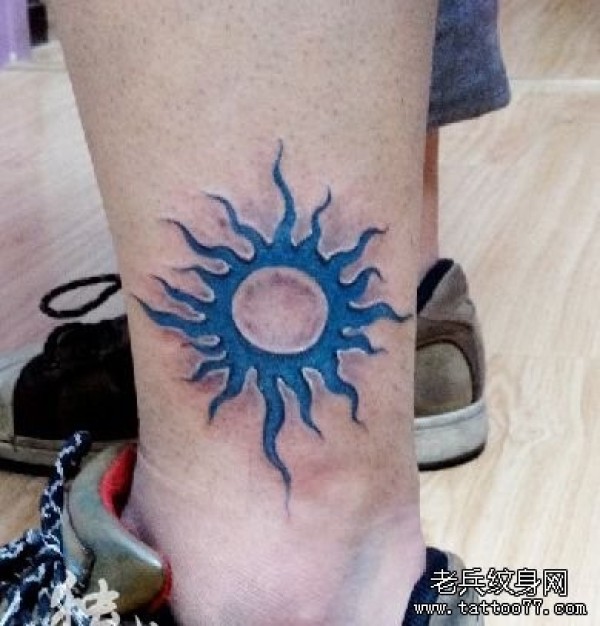 腿部一幅彩色烙印效果太阳纹身图片_腿部纹身图案大全_纹身图吧