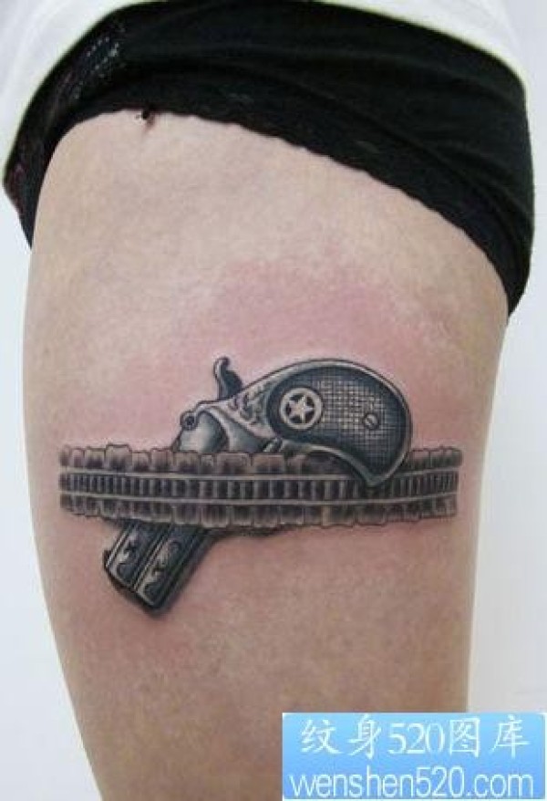 美女大腿经典的蕾丝手枪纹身图片_腿部纹身图案大全_纹身图吧
