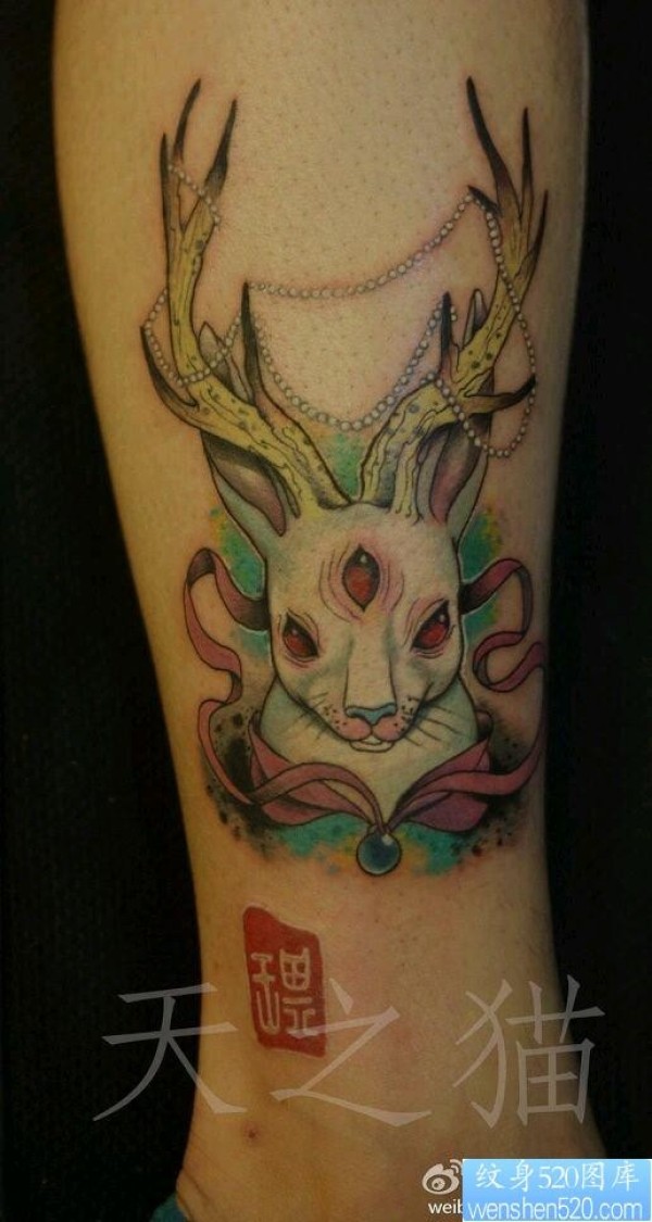 女人腿部前卫经典的鹿角兔子纹身图片_腿部纹身图案大全_纹身图吧