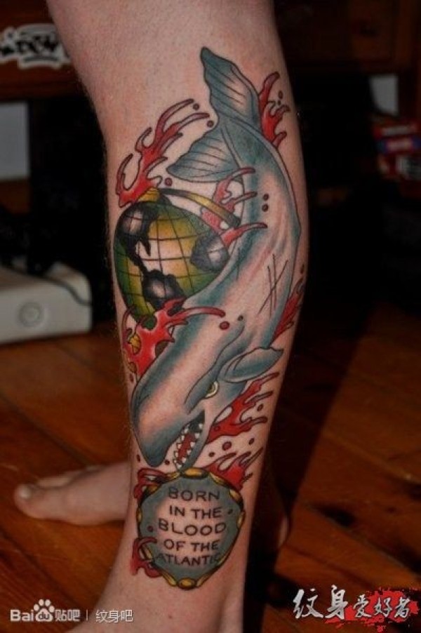 凶恶鲨鱼游走在小腿间刺青图片_腿部纹身图案大全_纹身图吧